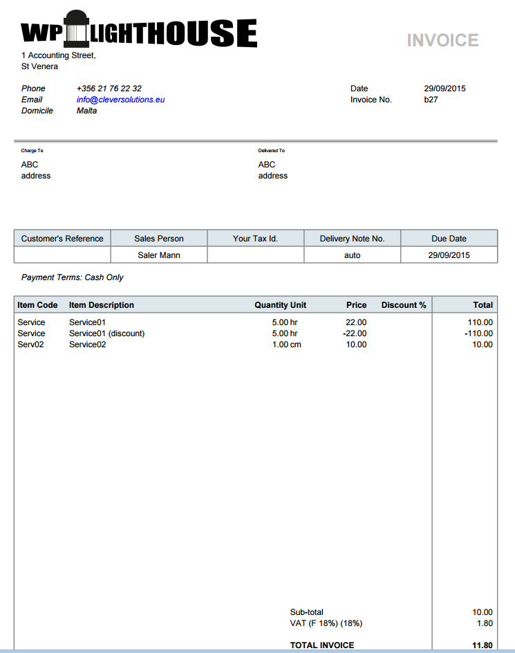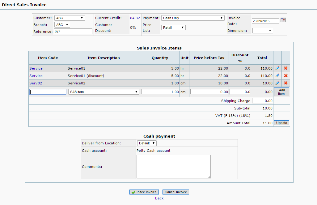 When we choose to offer an Service item (does not affect inventory) for free but would like to see the unit rate and qty in the printed invoice we need to enter the discount as a separate line item with negative rate to indicate the discount.