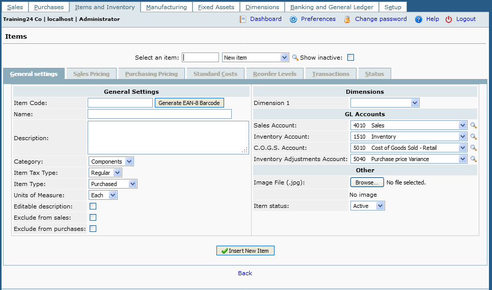 Items are the things you buy and sell in your business. Items are associated with an Item Type which is can be one of three values: Manufactured, Purchased or Service. If you nominate an item type as 'Manufactured' or 'Purchased' you can manage stock control and inventory through the Manufacturing menu. 'Service' items are not inventory controlled. Items are also associated with an Item Category (which you can define).