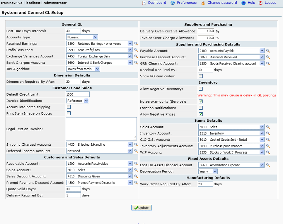 - Setup default values and GL account assignments for various aspects of your business.