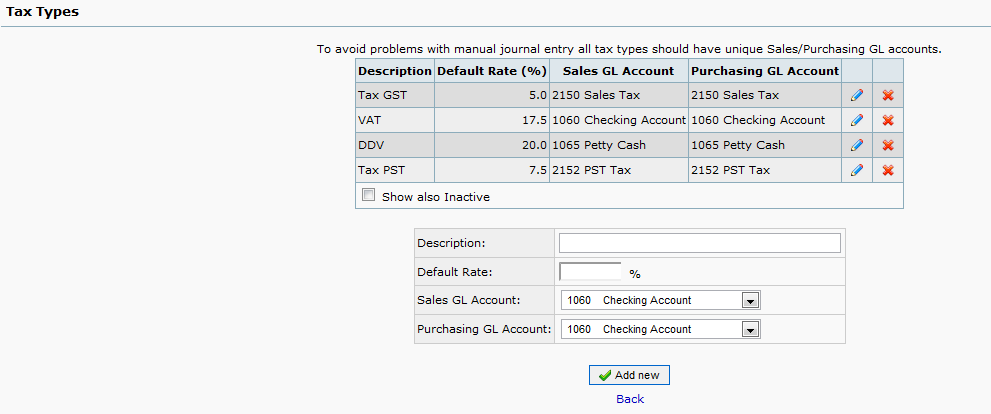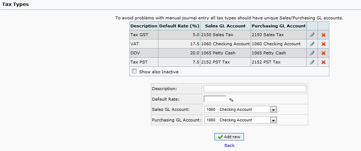 Define all tax rates you will require. Depending on the location of your business you may need to set up federal, state/provincial, municipal/county, environmental, or other taxes. It is recommended that a separate sale and purchase GL account is assigned to each tax you require. Once this is complete, you should setup your Tax Groups and Item Tax Types